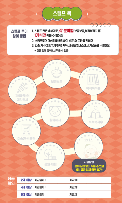 | 내 용 | 행사참여 식당, 도서관, 북카페, 반려동물동반숙소, 관광지 등 방문해서 도장찍고 스탬프 개수에 따라 기념품 증정. |