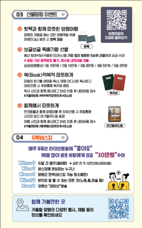 양평의 겨울을 찾는 모든 여행객을 위해 관광안내소 방문 시 핫팩 제공 하니 추운 겨울 꼭 받으셔서 따뜻하게 이벤트 참여해 보세요.