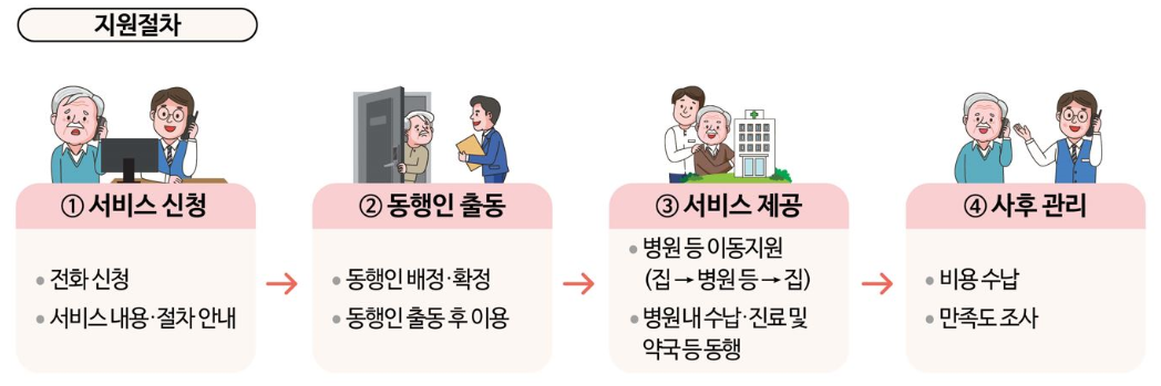 서비스신청을 하면 동행인배정 후 집 앞으로 출동하여 병원, 약국등 함께 동행하여 수납. 진료등을 도와줍니다.