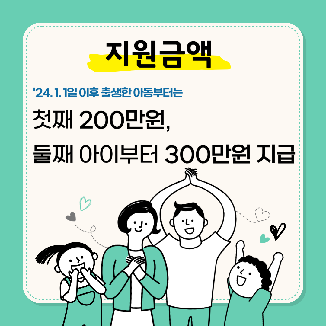 24년 1월 1일 이후 태어난 아동부터 첫째 200만원, 둘째부터 300만원의 이용권이 지급됩니다.