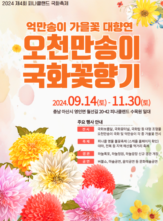 가족과 힐링하기 좋은 곳으로 4계절 모두 새로운 모습으로 봄의 화려한 튤립과 유채꽃, 여름의 수국과 백합, 가을의 국화와 코스모스, 그리고 겨울의 환상적인 조명 축제를 즐길 수 있습니다. 가을의 마지막 힐링을 느끼러 출발해 보실까요?