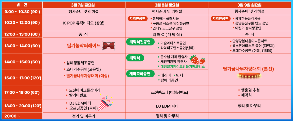 3월 8일 (9시 ~ 20시): 개막식 및 축하공연, 대형딸기케이크만들기퍼포먼스, EDM파티