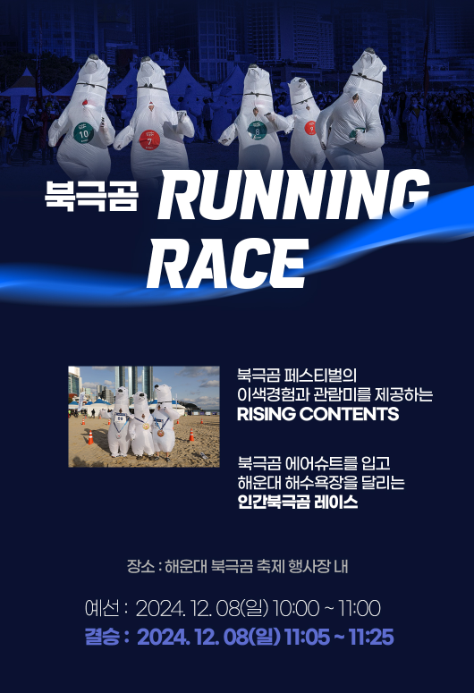 | 북극곰 RUNNING RACE 결승전 | 10:50 ~ 11:10 | 북극곰 에어슈트를 입고 참여하는 이색 RACE 결승전 운영 |