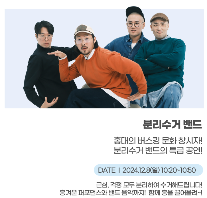 | HEATING STAGE | 10:20 ~ 10:50 | 분리수거 밴드와 함께하는 식전 콘서트 |