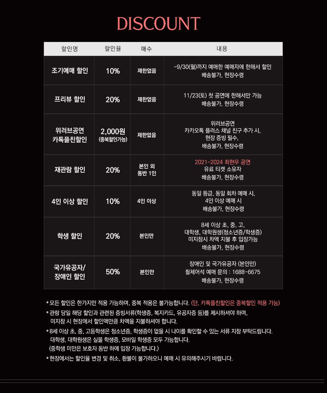 - 재관람 할인 : 20% (본인 외 동반 1인)