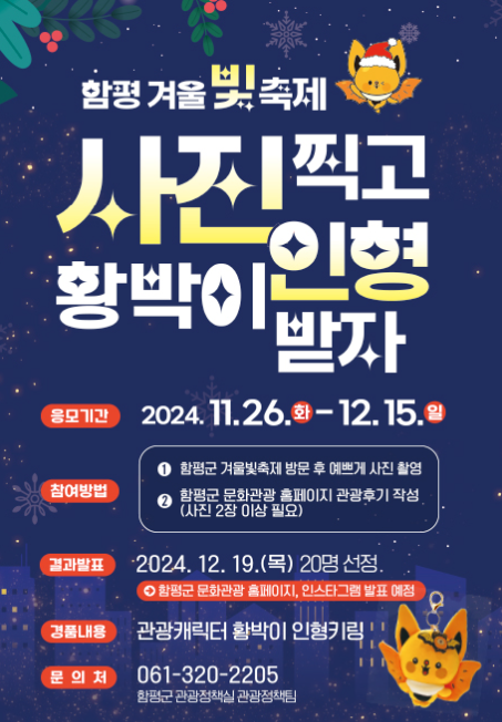 함평군 겨울빛축제에 방문 후 가족과 연인과 예쁘게 사진 촬영후 함평군 문화관광 홈페이지 관광후기에 작성하시면 됩니다. 사진 2장 이상 필요하다고 하네요. 결과 발표는 12.19일 20명 선정으로 관광캐릭터 황박이 인형키링을 증정합니다.