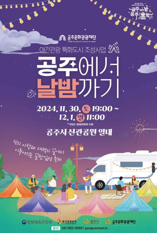 2024 공주에서 날밤 까기는 금강 신관공원에서 펼쳐지는 캠핑 축제이다. '공주에서 날밤 까기'는 밤새 즐길 수 있는 여러 프로그램과 이벤트로 쌀쌀한 늦가을의 매력을 한껏 보여줄 예정이다. 캠핑에서 빠질 수 없는 캠프파이어를 미디어아트로 연출하고 낭만적인 무대를 선보일 예정이며 추운 날씨를 잠시 피할 수 있는 야간 나이트클럽과 영화관 등 캠퍼뿐만 아니라 일반 시민들도 즐길 수 있는 다양한 체험거리, 볼거리가 있다. '공주에서 날밤까기'는 다양한 즐길거리와 먹거리를 제공하며 캠퍼들에게는 금강 인근에서 캠핑하면서 낭만적인 밤을 보낼 수 있다.